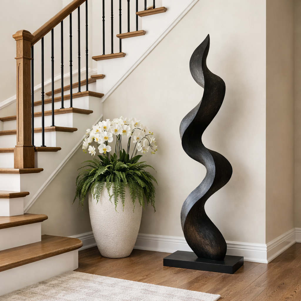 Ideal for living rooms, entryways, lounges, and hospitality interiors, this sculpture works well as a standalone art statement or as part of a curated modern space. Its form introduces visual rhythm while maintaining a serene and minimal character. Because it is crafted from solid wood and finished by hand, slight variations in grain and surface details are expected, each sculpture is uniquely its own.