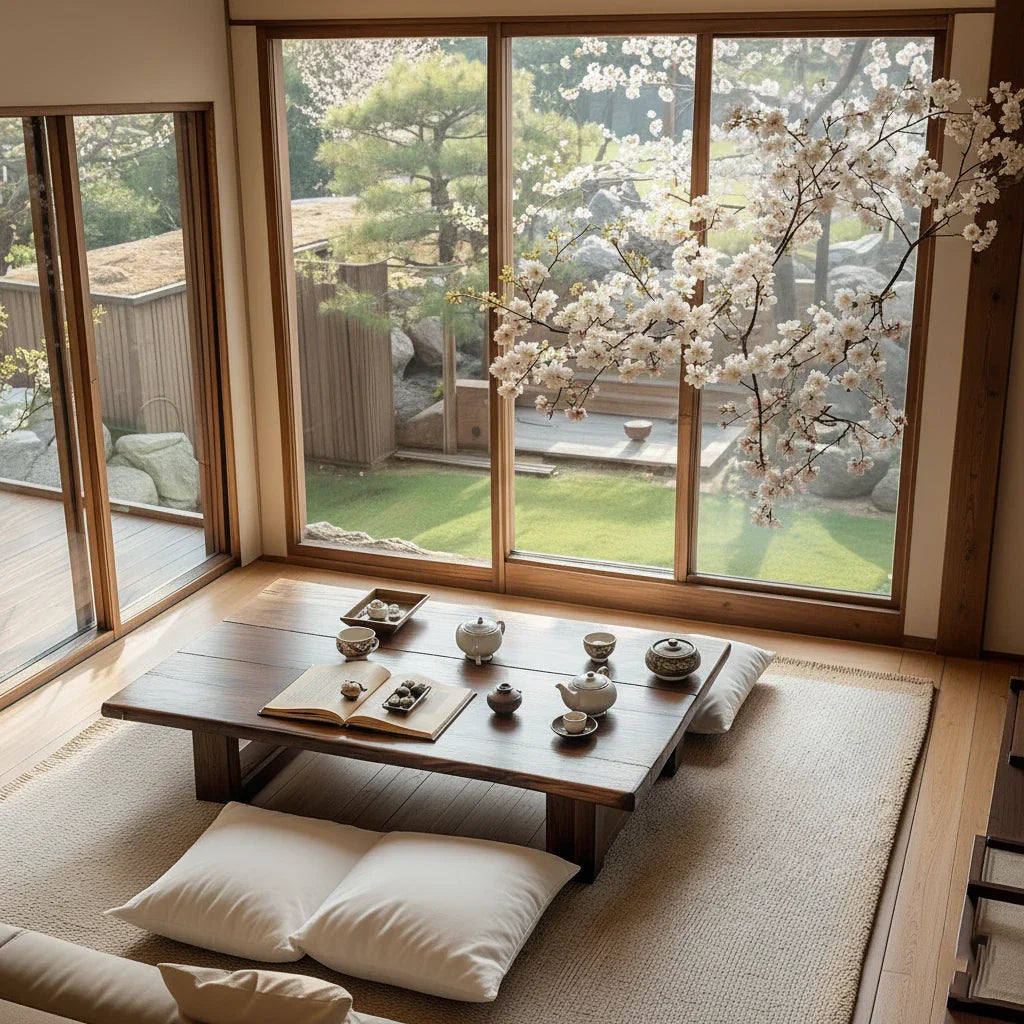 Ideal for a tatami room, a tea corner by the garden, or a Japandi-inspired living area, this low tea table blends seamlessly with neutral textiles, shoji-style doors, and indoor greenery. It functions as both practical furniture and refined natural-wood décor, grounding the room with warmth and gentle elegance. Combining solid-wood construction, clean lines, and a peaceful low profile, it brings harmony, comfort, and a timeless Japanese aesthetic to any modern interior.