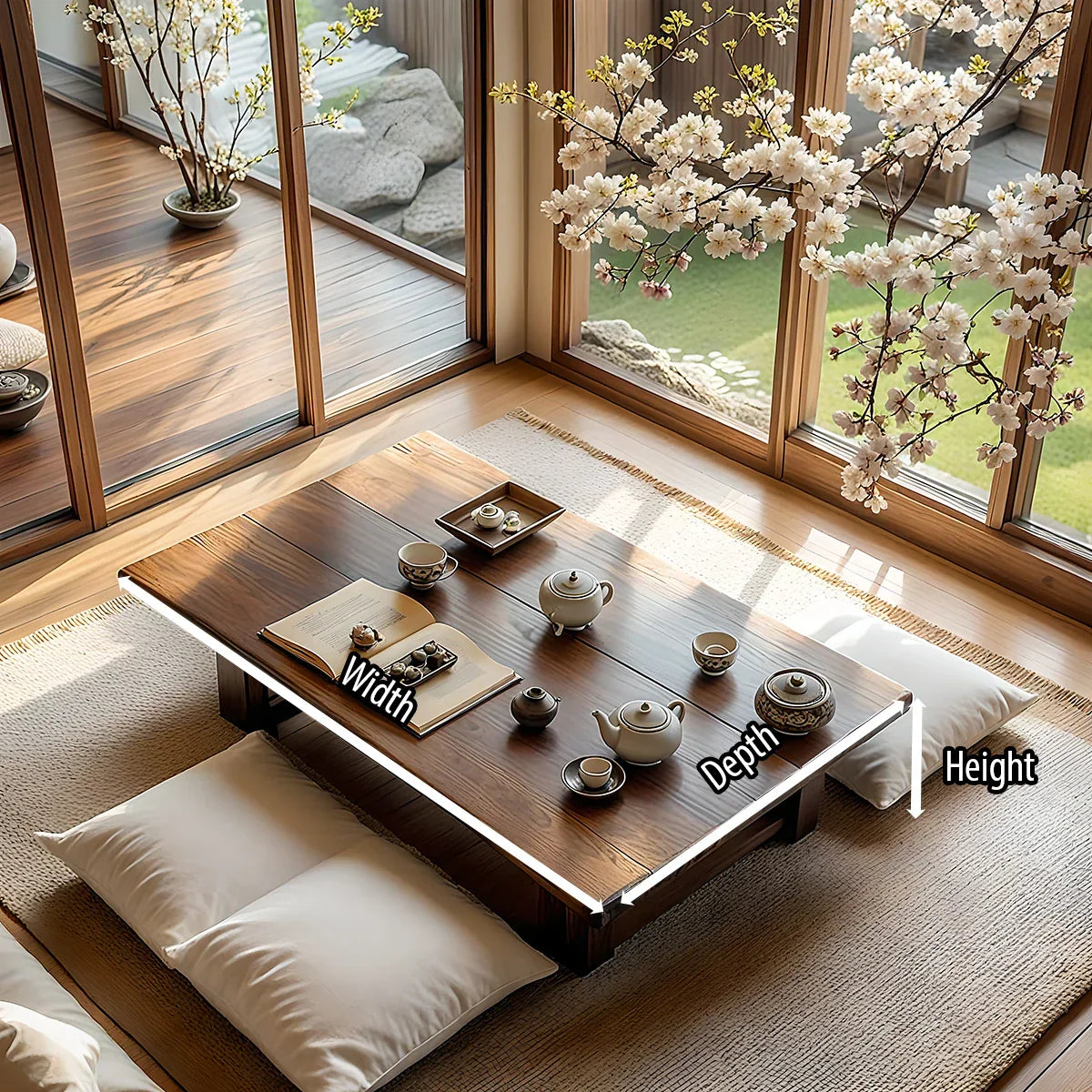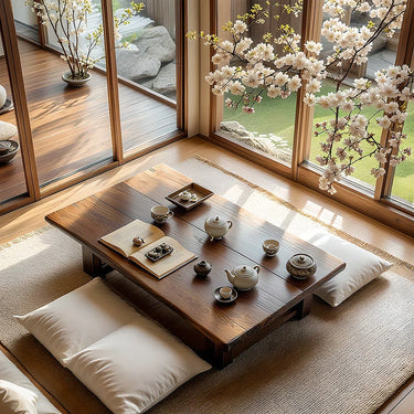 This solid-wood floor tea table is designed as a serene centerpiece for Japanese-style interiors and calm, modern homes. The low rectangular form stretches gracefully across the room, offering an inviting surface for teaware, books, and quiet daily rituals. Paired with soft floor cushions and bathed in natural light, it creates an intimate setting that encourages slower moments of reflection and conversation.
