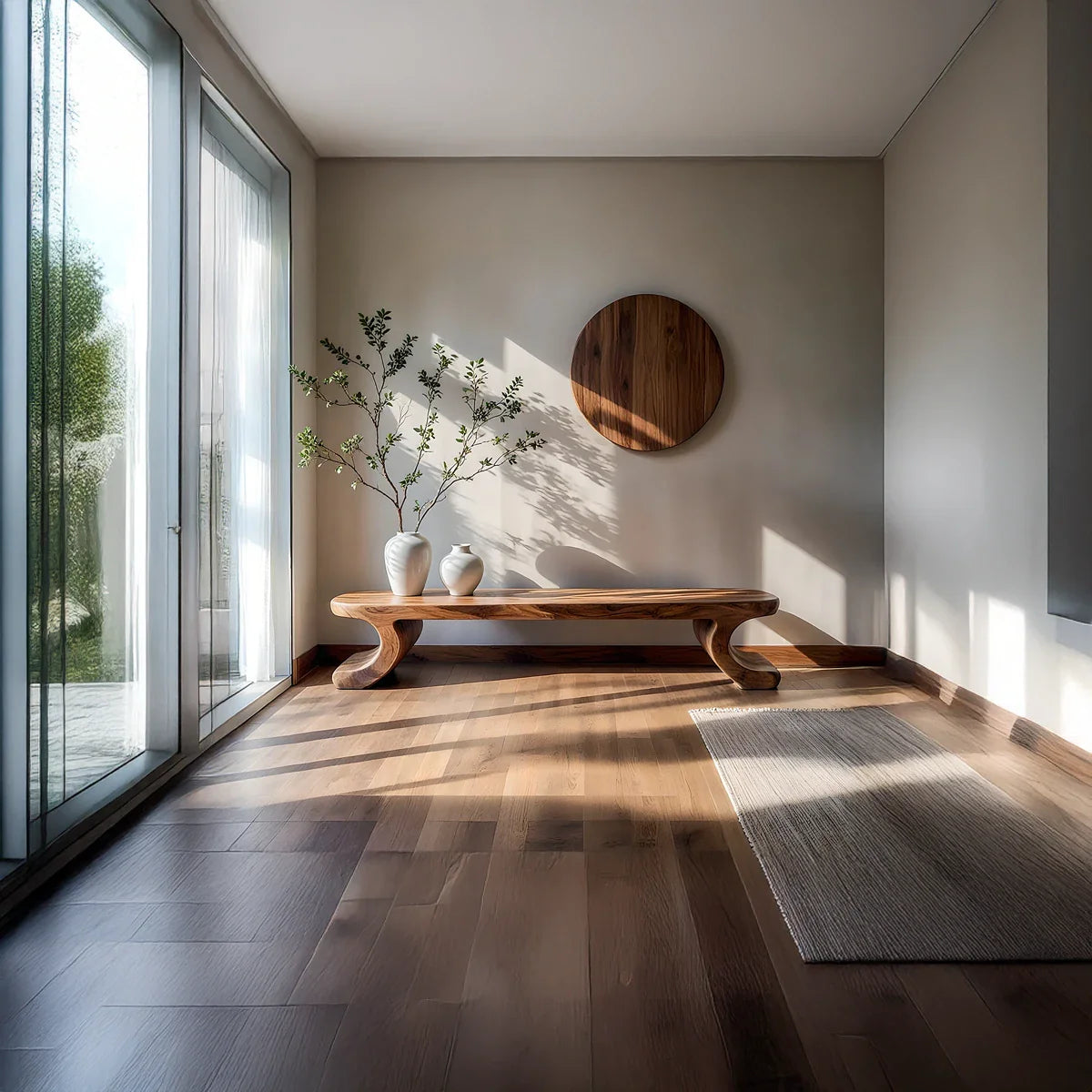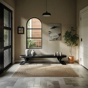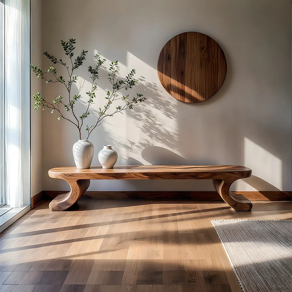 Quietly sculptural and beautifully grounded, this solid wood low bench is designed to bring warmth and calm structure into modern interiors. The long, streamlined seat creates a clean horizontal line, while the curved feet add a subtle sense of movement and softness at each end. With its low profile and refined simplicity, it pairs naturally with Japandi, minimalist, organic modern, and contemporary home decor.