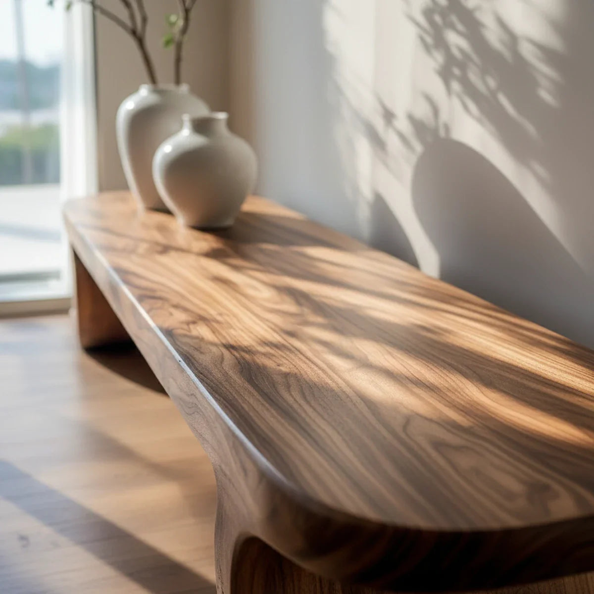 Handcrafted and hand-finished from natural solid wood, the surface showcases rich grain flow and tonal variation that becomes more dimensional in changing light. The edges are gently rounded for a smooth touch, and the base is shaped to feel integrated and architectural rather than decorative. Because each piece is made from real timber and finished by hand, natural differences in grain, knots, and color are expected every bench is truly one of a kind, with unique character that cannot be replicated.