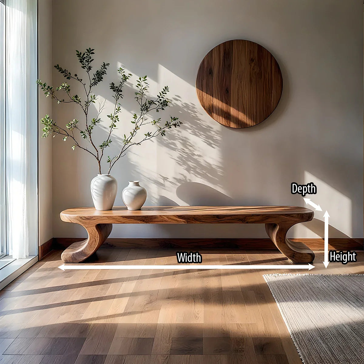 Designed for versatile use, this piece works beautifully as a low seating bench in a living room, a hallway accent beneath wall art, or an end-of-bed bench that adds warmth without visual clutter. The generous top offers space for styling ceramics, books, or a single vase, while the grounded stance keeps the silhouette calm and balanced. Ideal for modern homes, boutique studios, and serene hospitality spaces, this natural wood bench delivers timeless craftsmanship, understated luxury, and a quiet focal point for curated interiors.