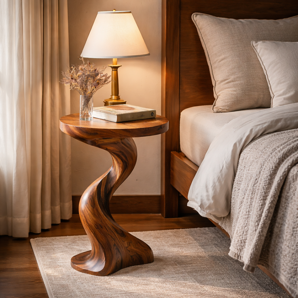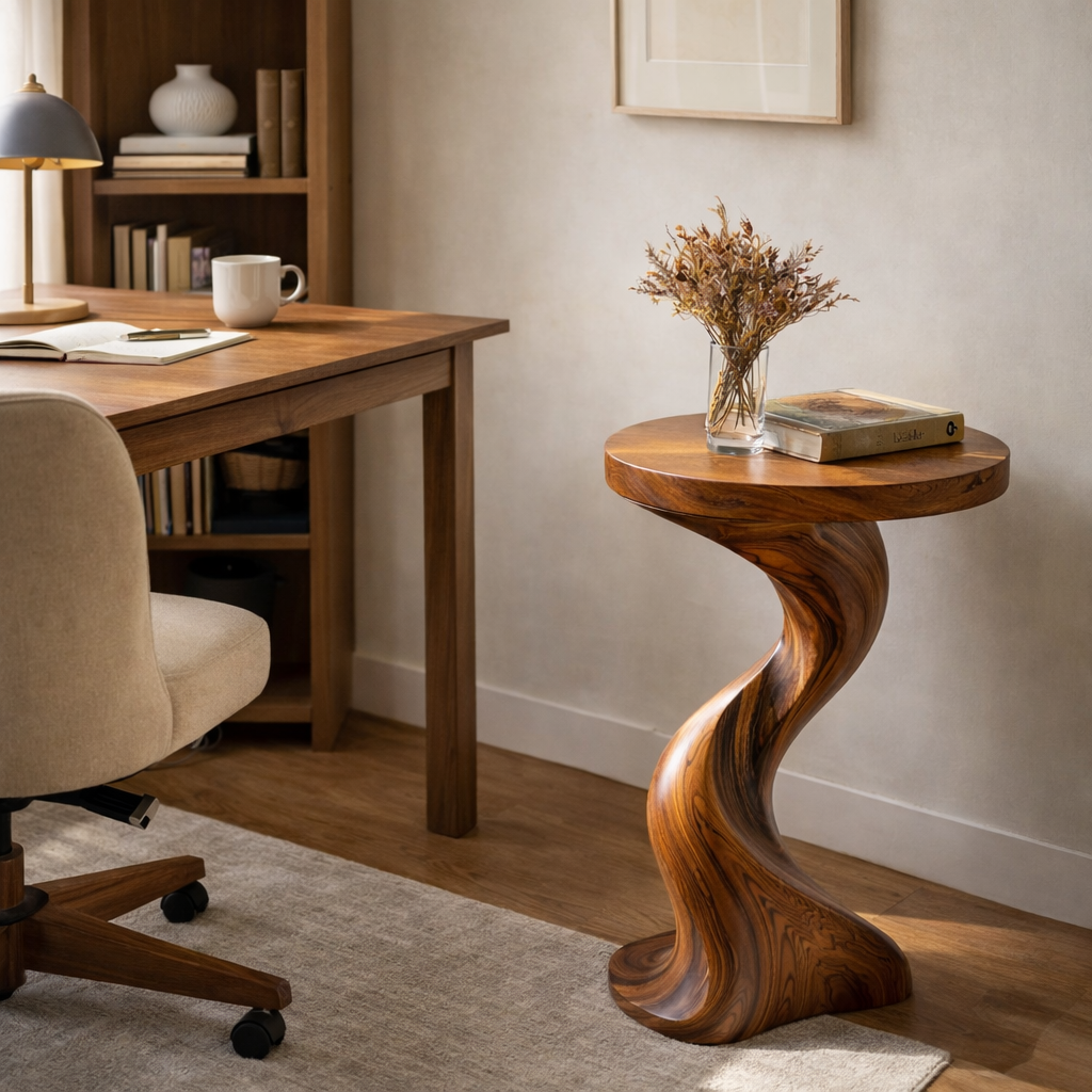 This sculpted side table in solid wood introduces a warm organic accent to living rooms, reading corners, and bedroom seating areas. The round top is supported by a twisted pedestal base with smooth curves that create a gentle sense of movement while keeping the table compact and easy to place beside a sofa or lounge chair.