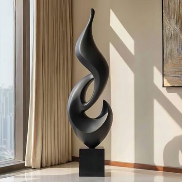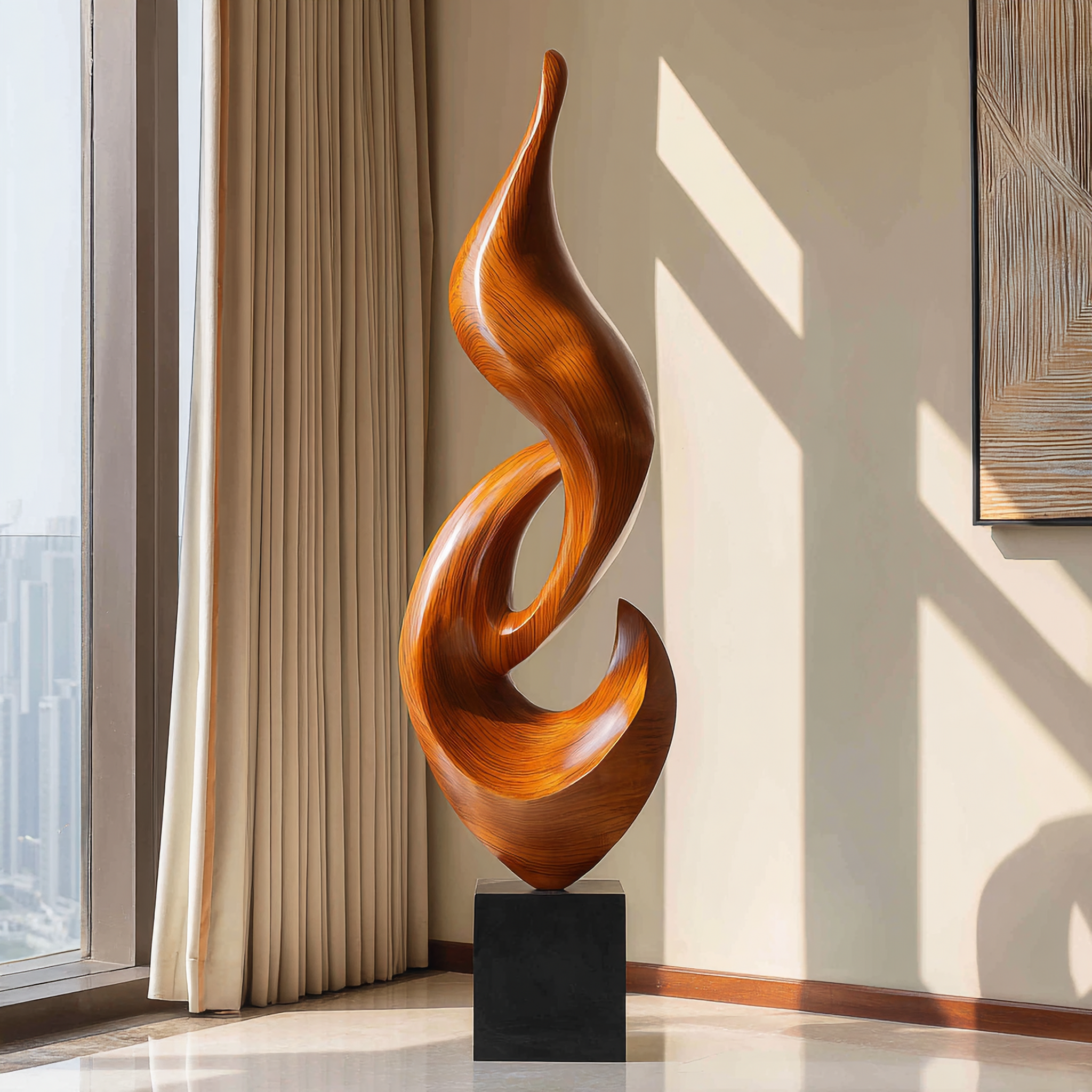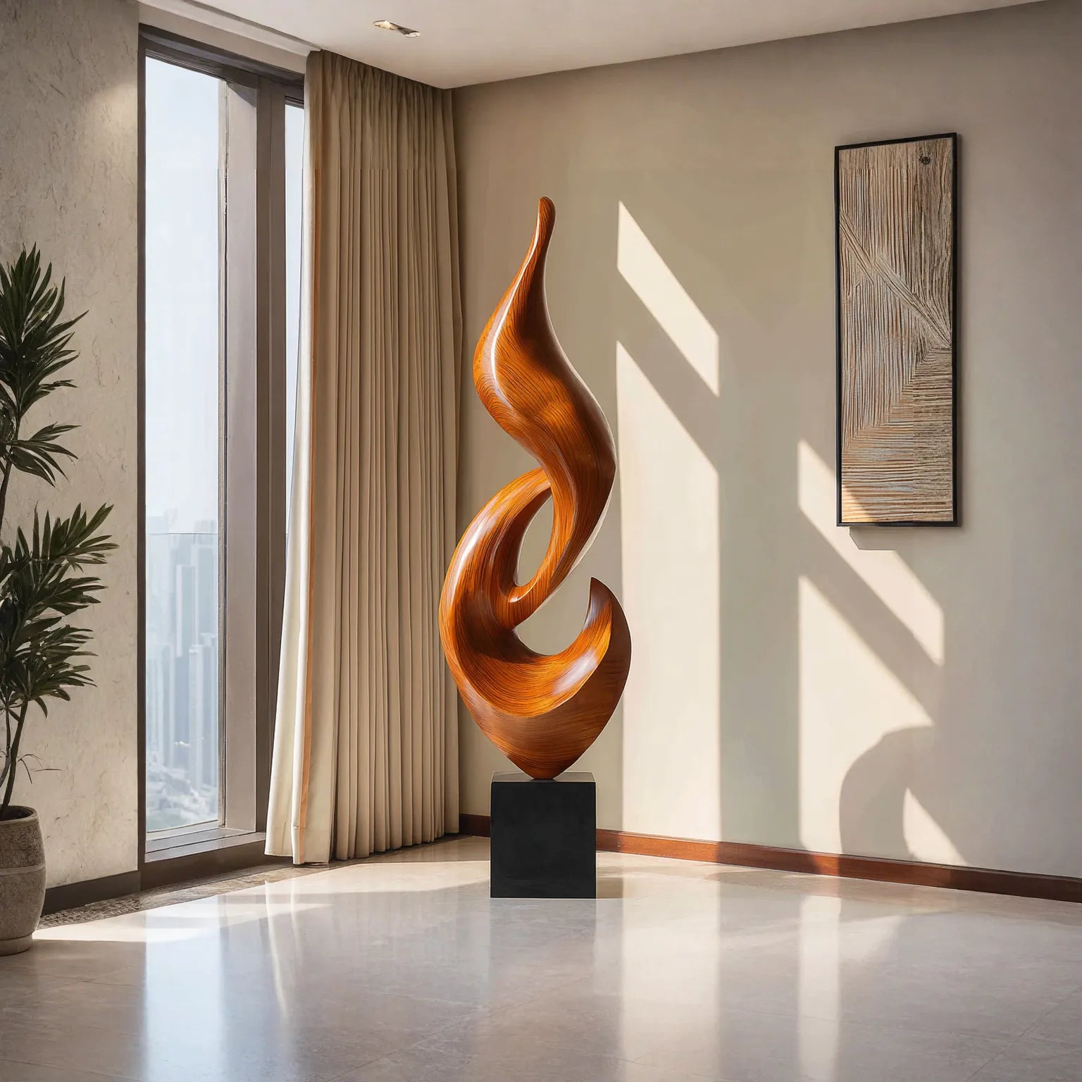 This contemporary solid wood sculpture features a continuous, flame-inspired form that rises in a smooth, flowing curve. The open center and sculpted contours create a sense of movement and refined balance, while the carefully finished surface highlights the natural grain of the wood. As light shifts throughout the day, soft highlights and shadows glide across the curves, giving the piece a quietly dynamic presence.
