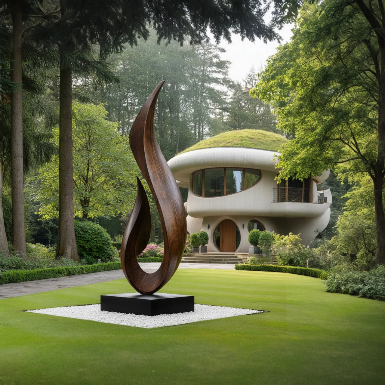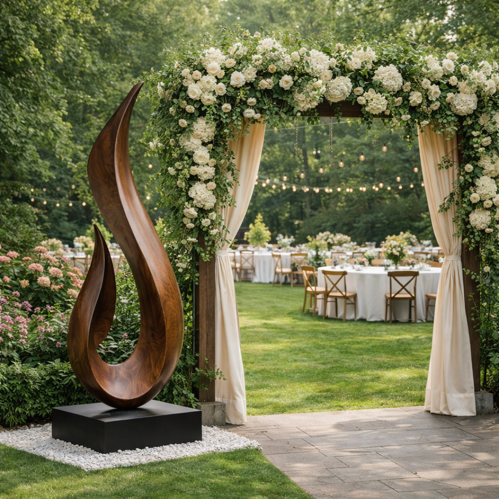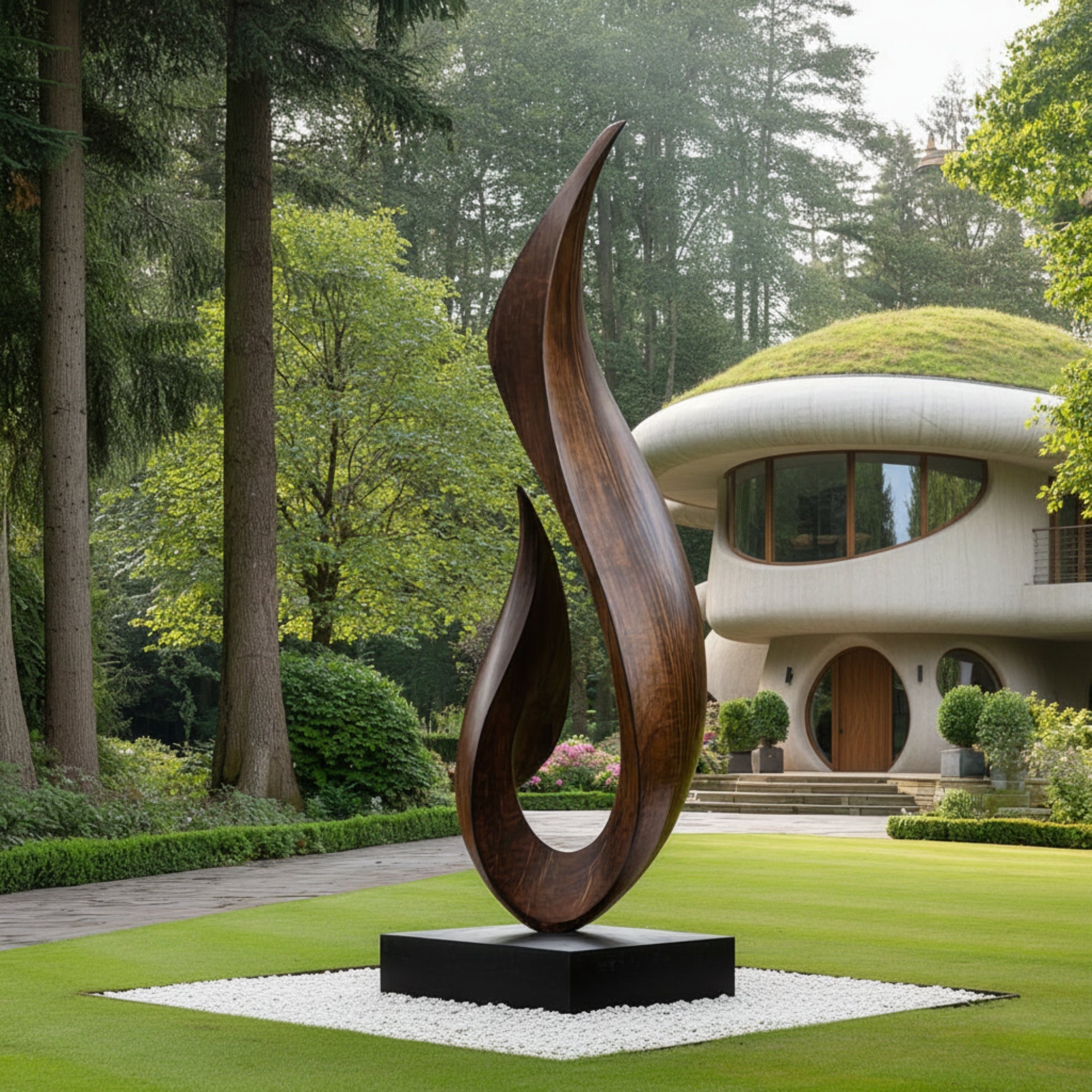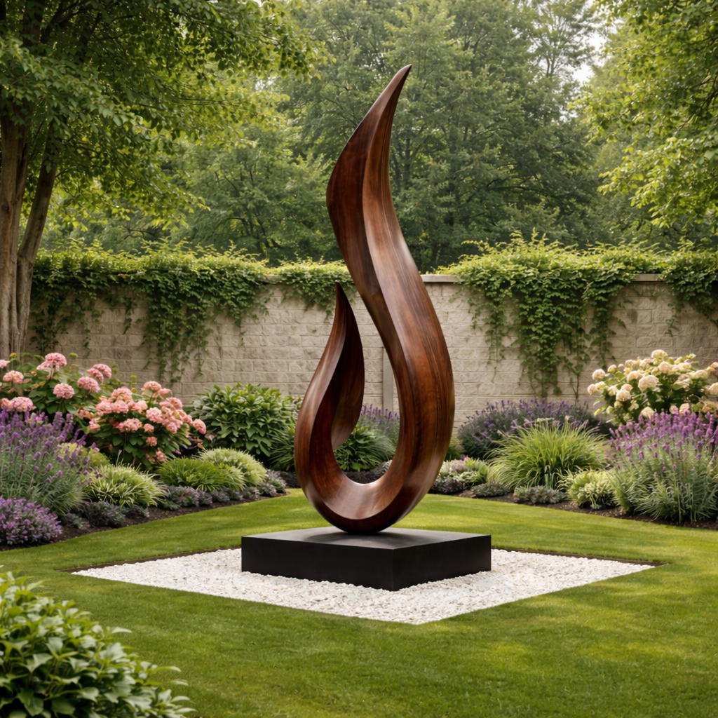 This tall flame form solid wood garden sculpture introduces a flowing vertical accent for modern outdoor landscapes. The sweeping curves rise from a solid base in a fluid gesture, creating a dynamic yet calm silhouette that stands out beautifully on lawns, in courtyards, or near patio seating areas.