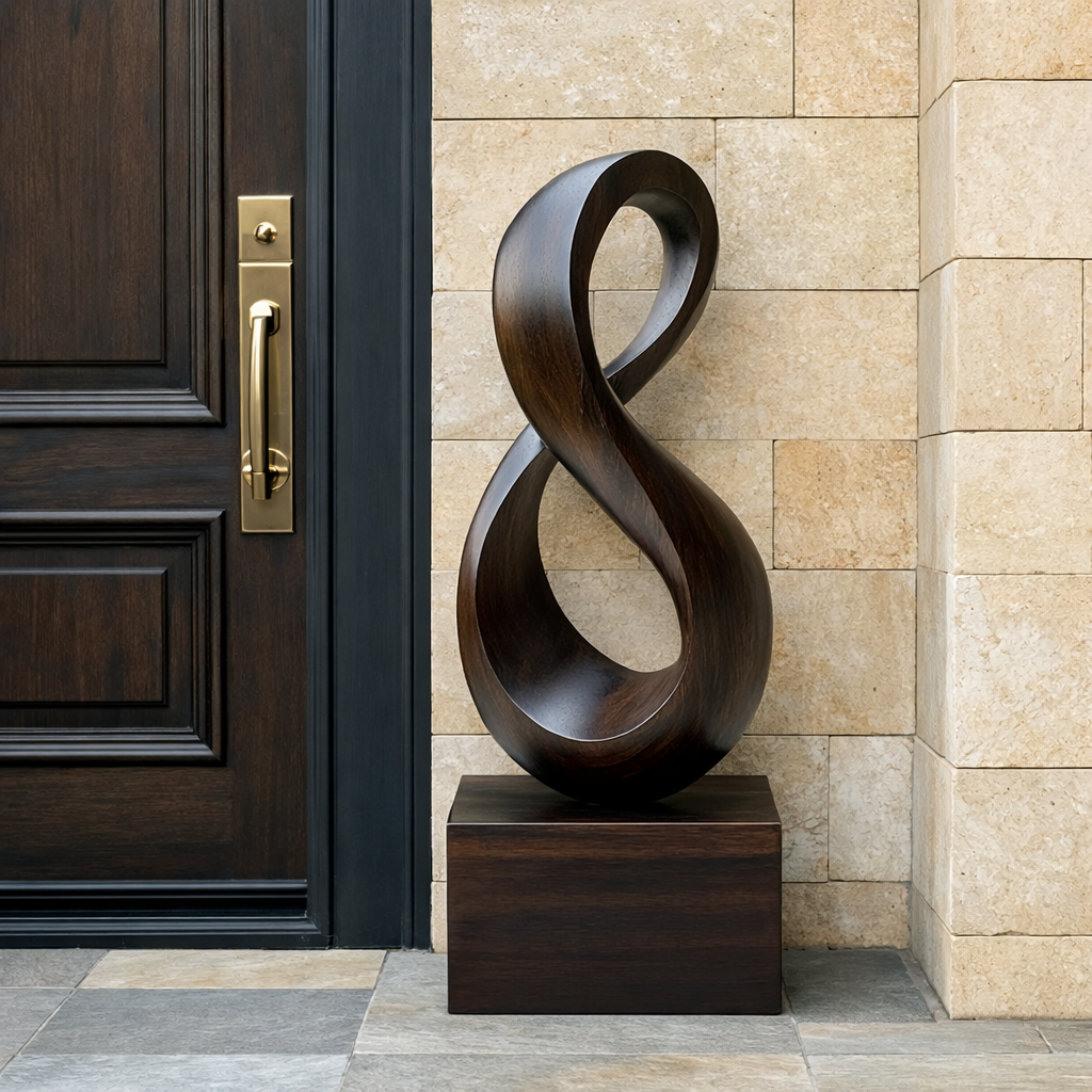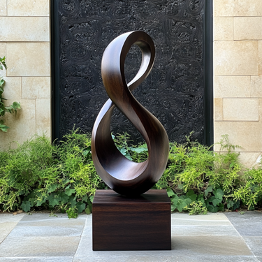 This contemporary solid wood sculpture features an elegant infinity loop form that flows in a continuous curve, creating a sense of movement, balance, and quiet harmony. The open center and smooth transitions between each twist invite light to pass through the piece, while the carefully finished surface highlights the natural grain of the wood and adds subtle depth from every angle.