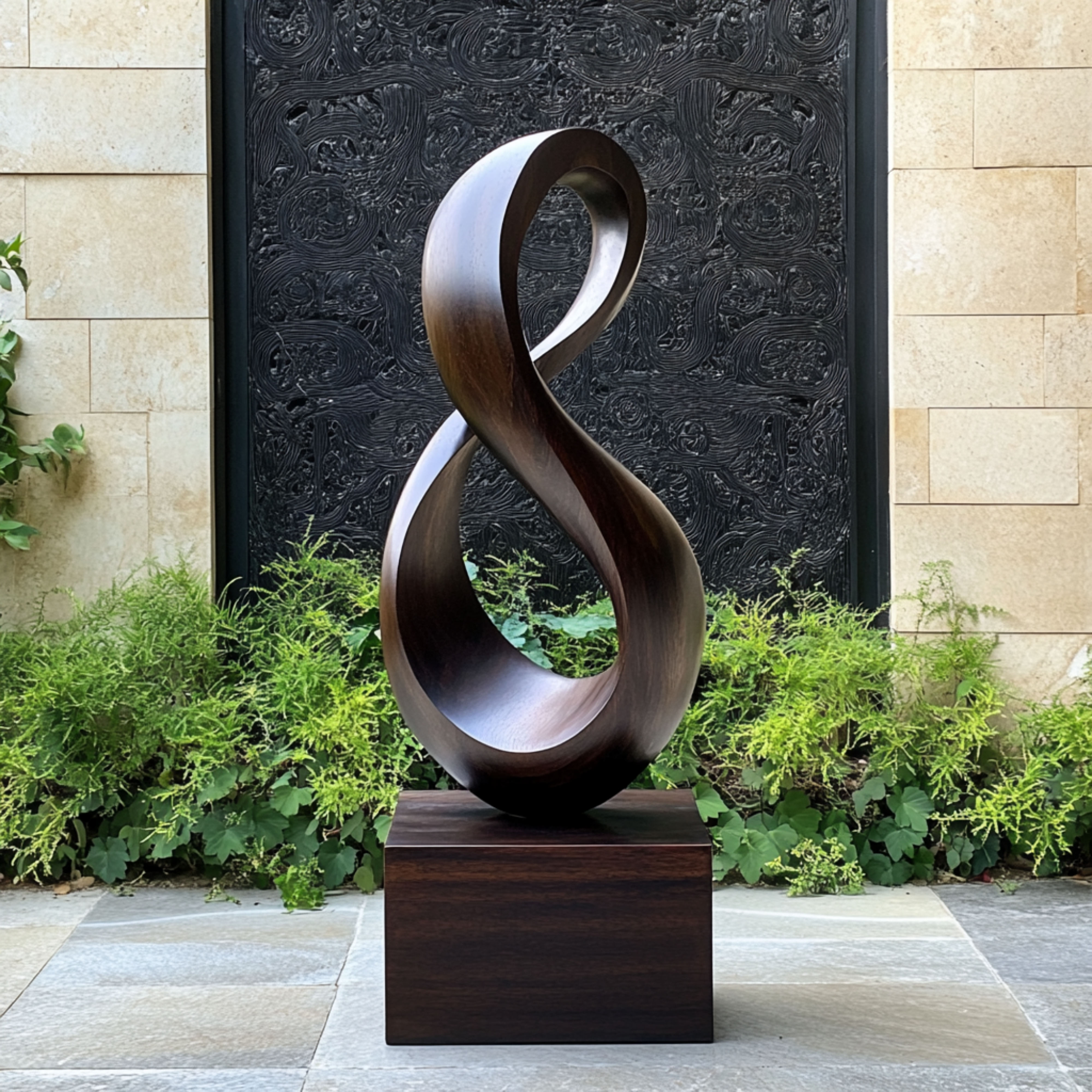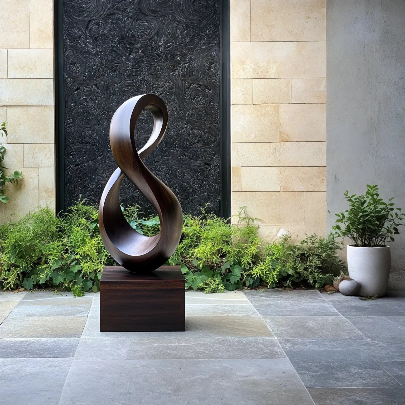 Designed for both indoor and sheltered outdoor settings, the sculpture rests on a solid plinth and becomes a striking focal point for living rooms, entry halls, corridors, covered porches, terraces, and courtyard gardens. It pairs beautifully with Contemporary, Japandi, Minimalist, and Elevated Modern décor styles, bringing warmth, organic texture, and sculptural character to both urban apartments and larger homes.