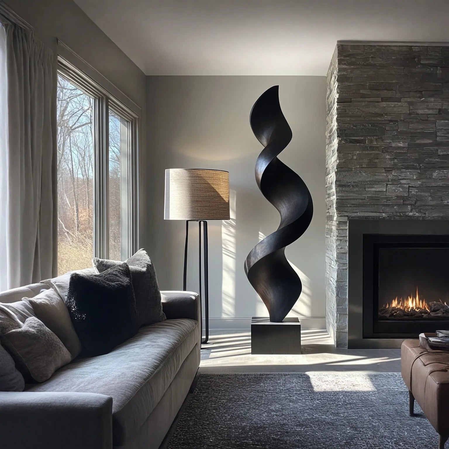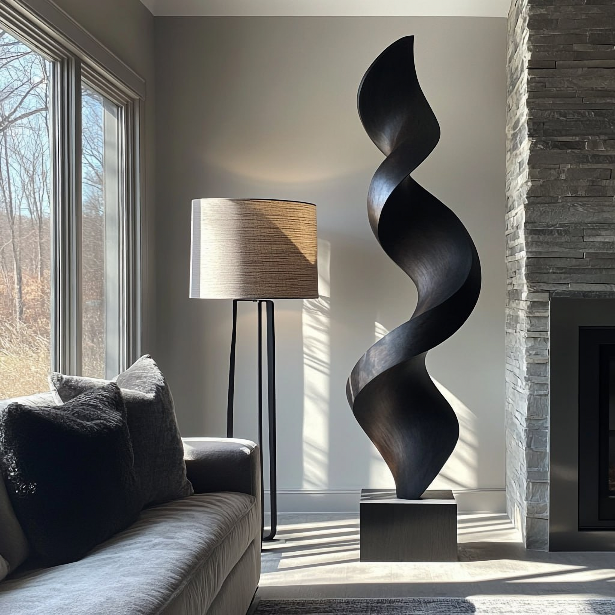 This contemporary solid wood sculpture features a continuous spiral form that twists upward in a graceful, flame-like movement. The smooth curves and subtle ridges create a sense of motion and refined balance, while the satin-like surface finish highlights the natural grain of the wood. As light shifts throughout the day, soft highlights and shadows glide across the contours, giving the piece a quietly dynamic presence.