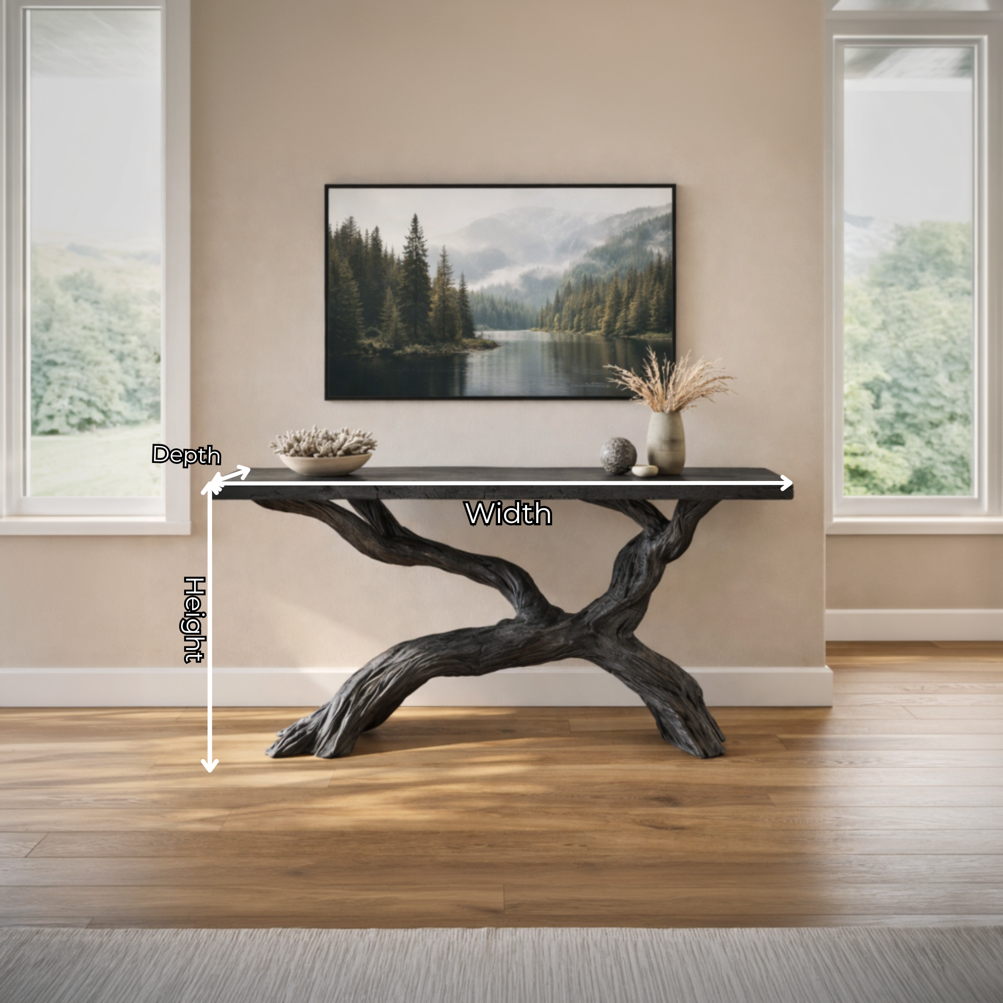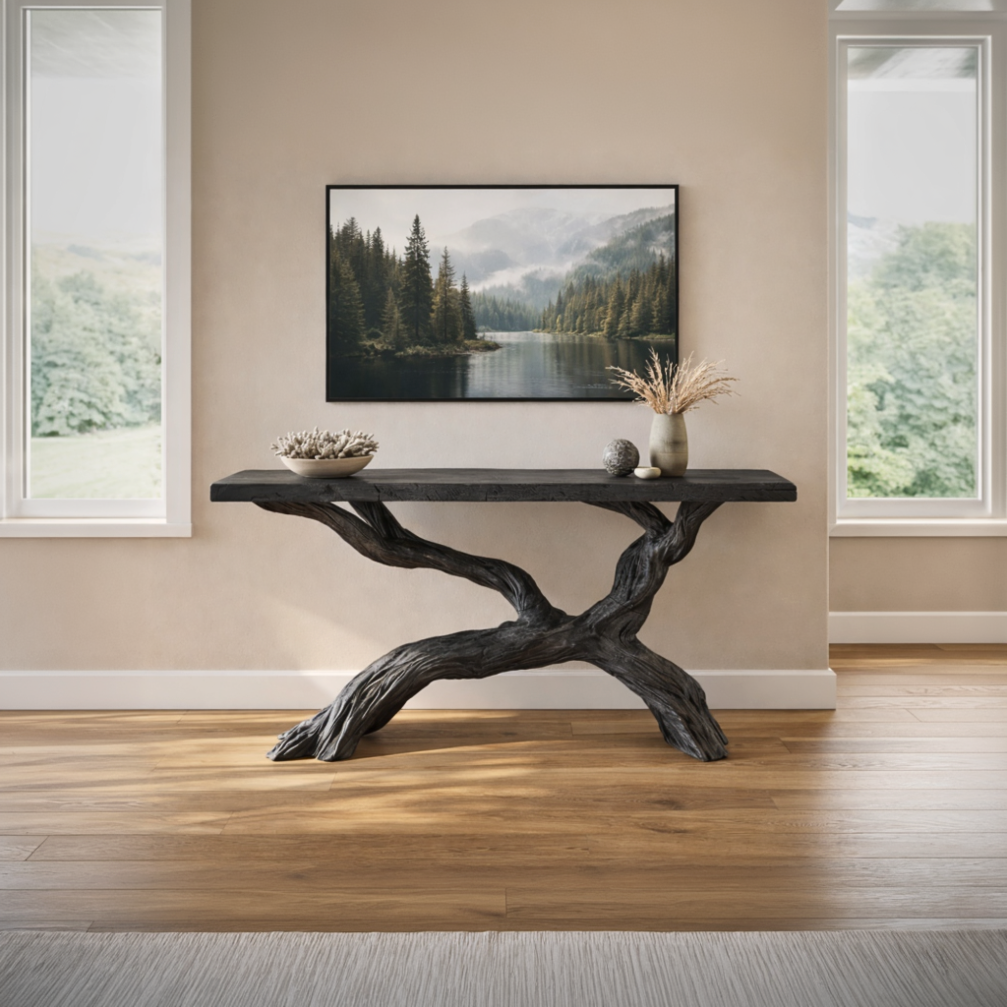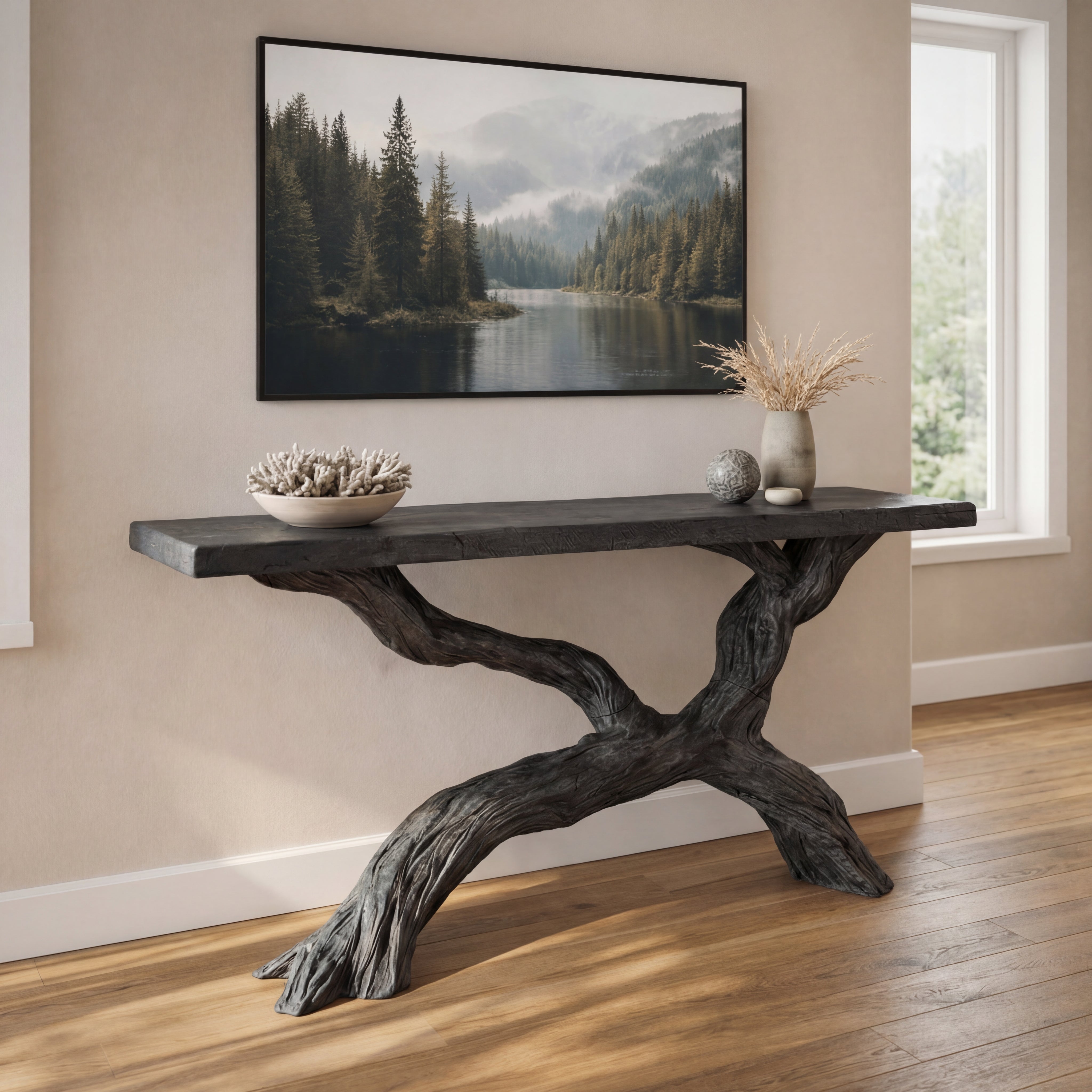 Elevate your interior with a console table designed to balance sculptural expression with everyday function. Defined by its intersecting branch-inspired base and clean, elongated top, this piece brings movement, depth, and a grounded organic presence into the home. Its distinctive silhouette creates a strong visual focal point while still offering practical surface space for styling in entryways, living rooms, hallways, or behind a sofa.
