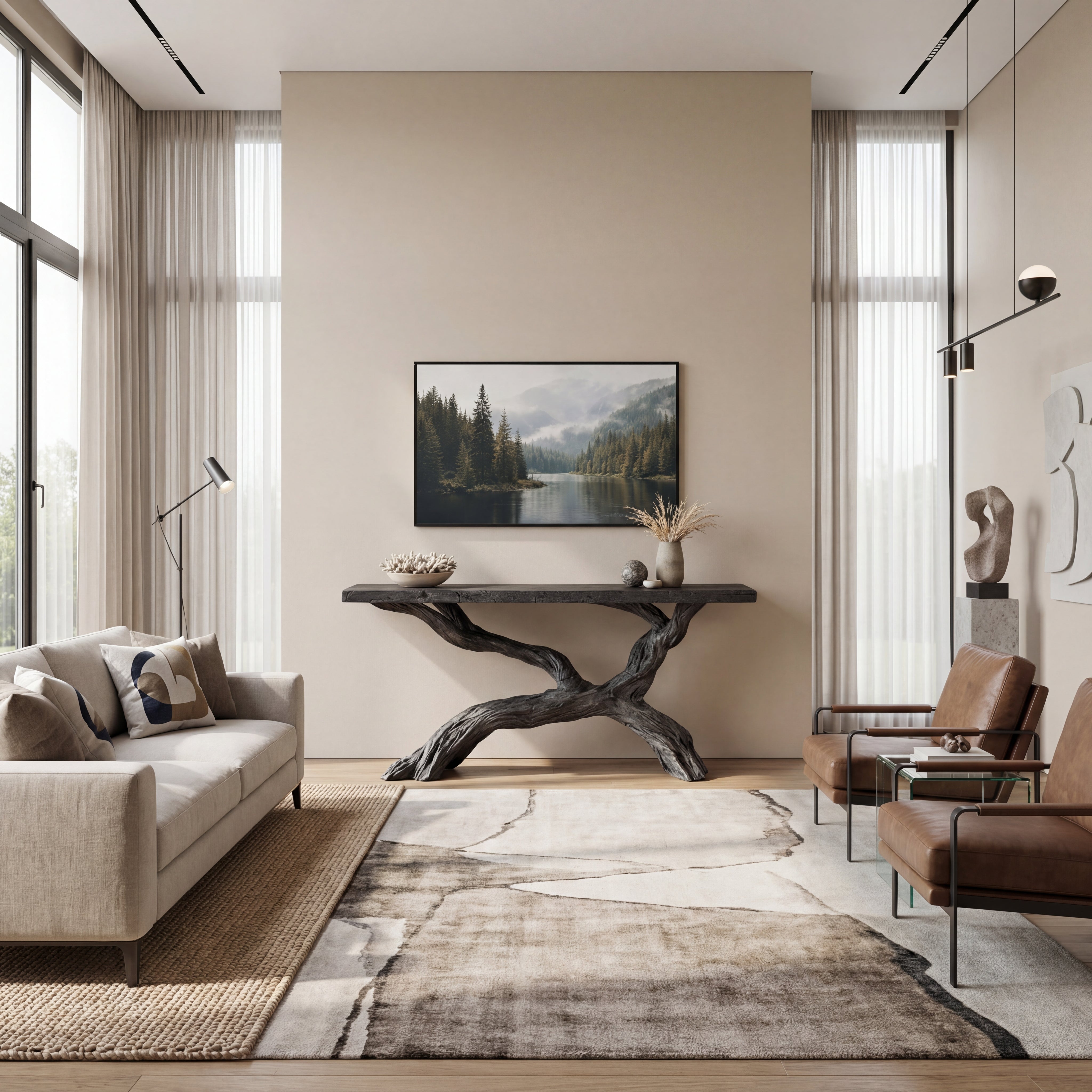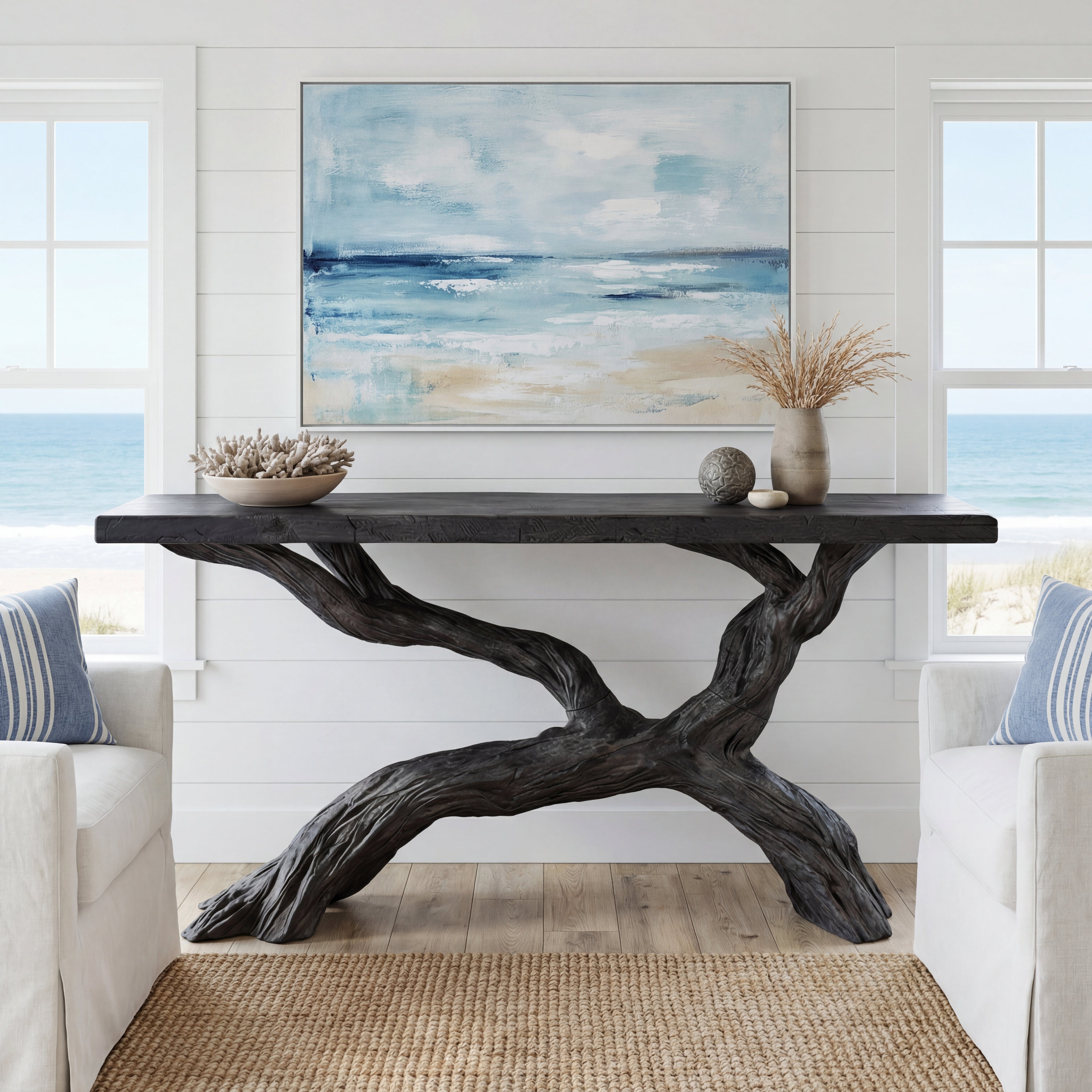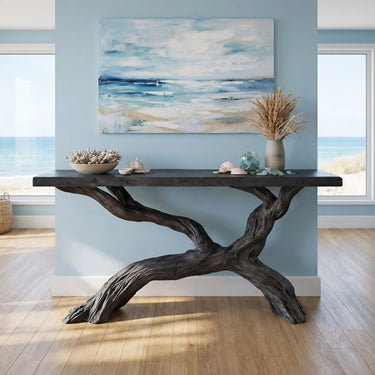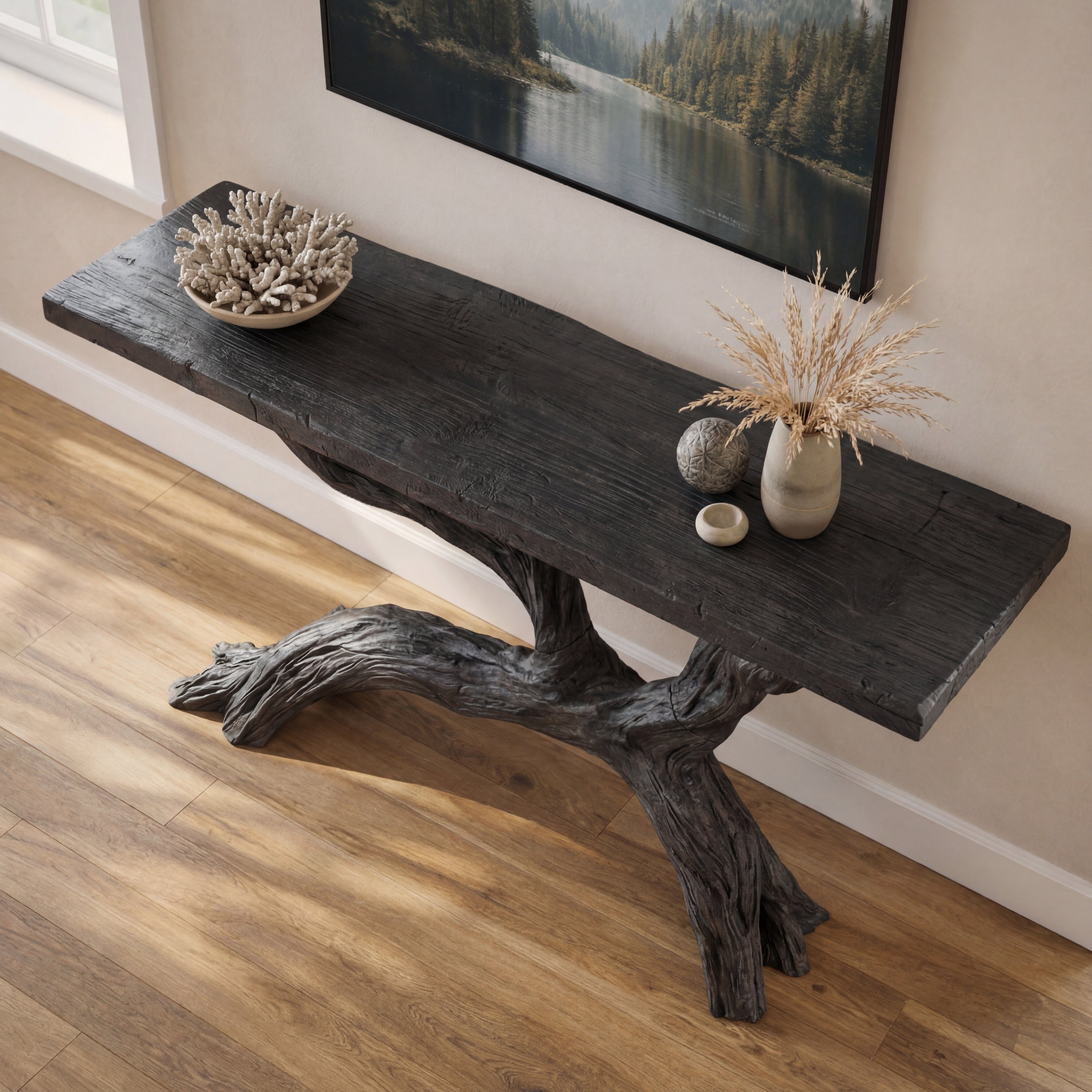 Elevate your interior with a console table designed to balance sculptural expression with everyday function. Defined by its intersecting branch-inspired base and clean, elongated top, this piece brings movement, depth, and a grounded organic presence into the home. Its distinctive silhouette creates a strong visual focal point while still offering practical surface space for styling in entryways, living rooms, hallways, or behind a sofa.