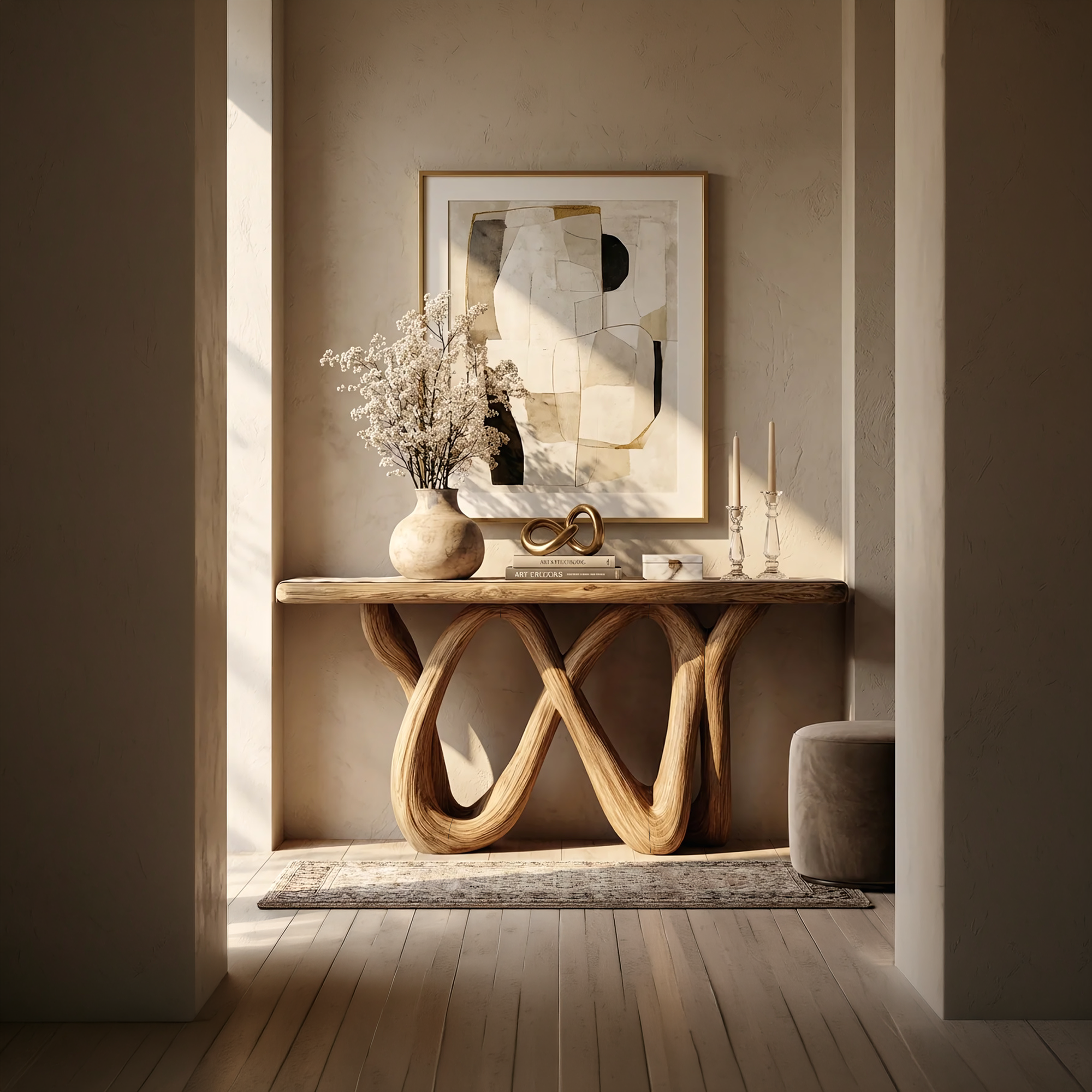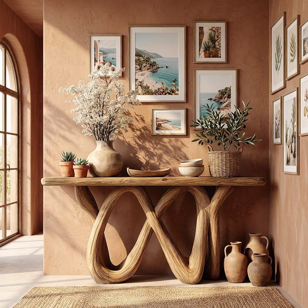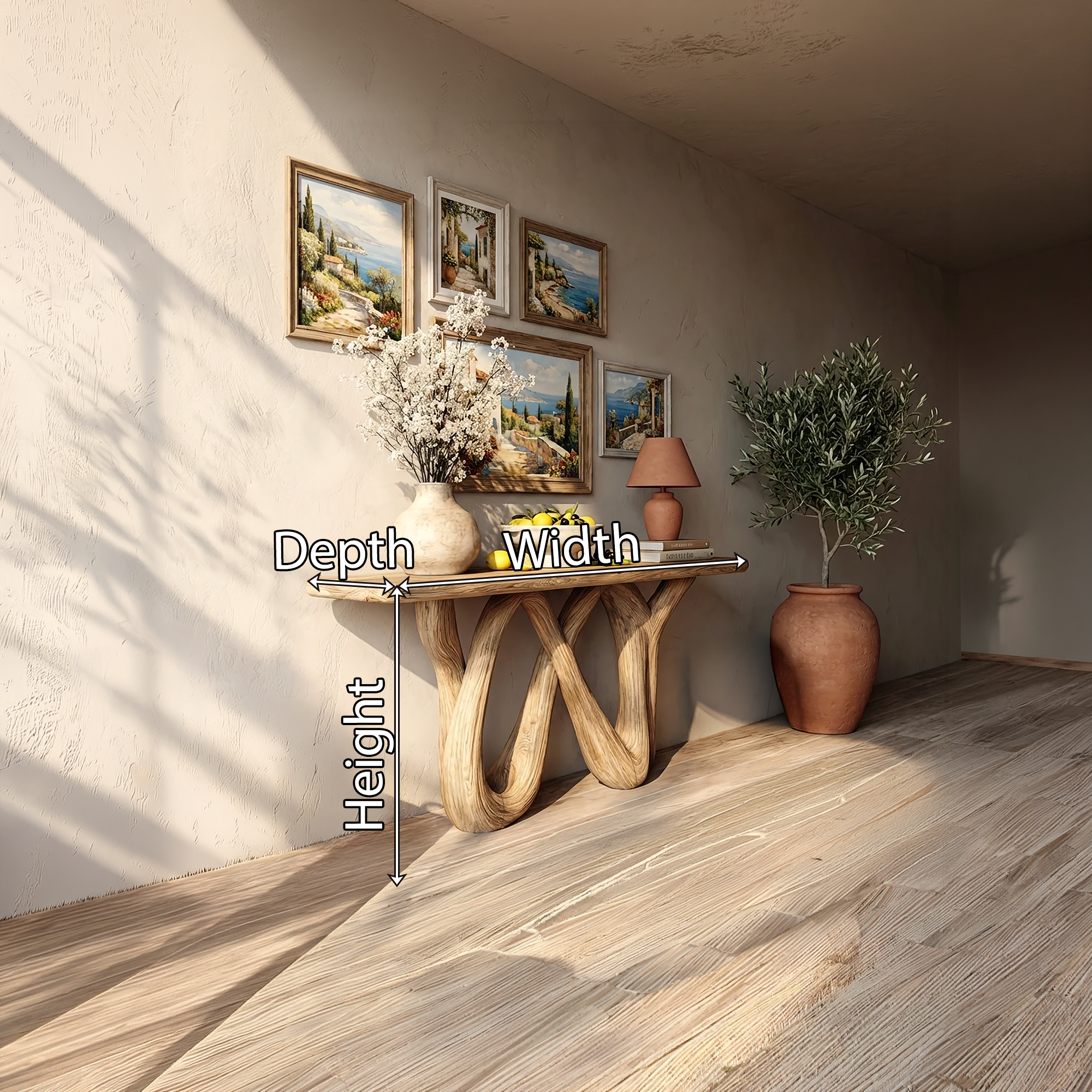 Perfect for entryways, living rooms, hallways, or Mediterranean-inspired interiors, this console table serves as both a functional display surface and a sculptural focal point. Style it with ceramics, woven baskets, framed art, or greenery to create a warm, curated vignette. Its organic modern aesthetic complements coastal, rustic, Japandi, and contemporary spaces, adding texture and natural warmth against plaster or earthy-toned walls.